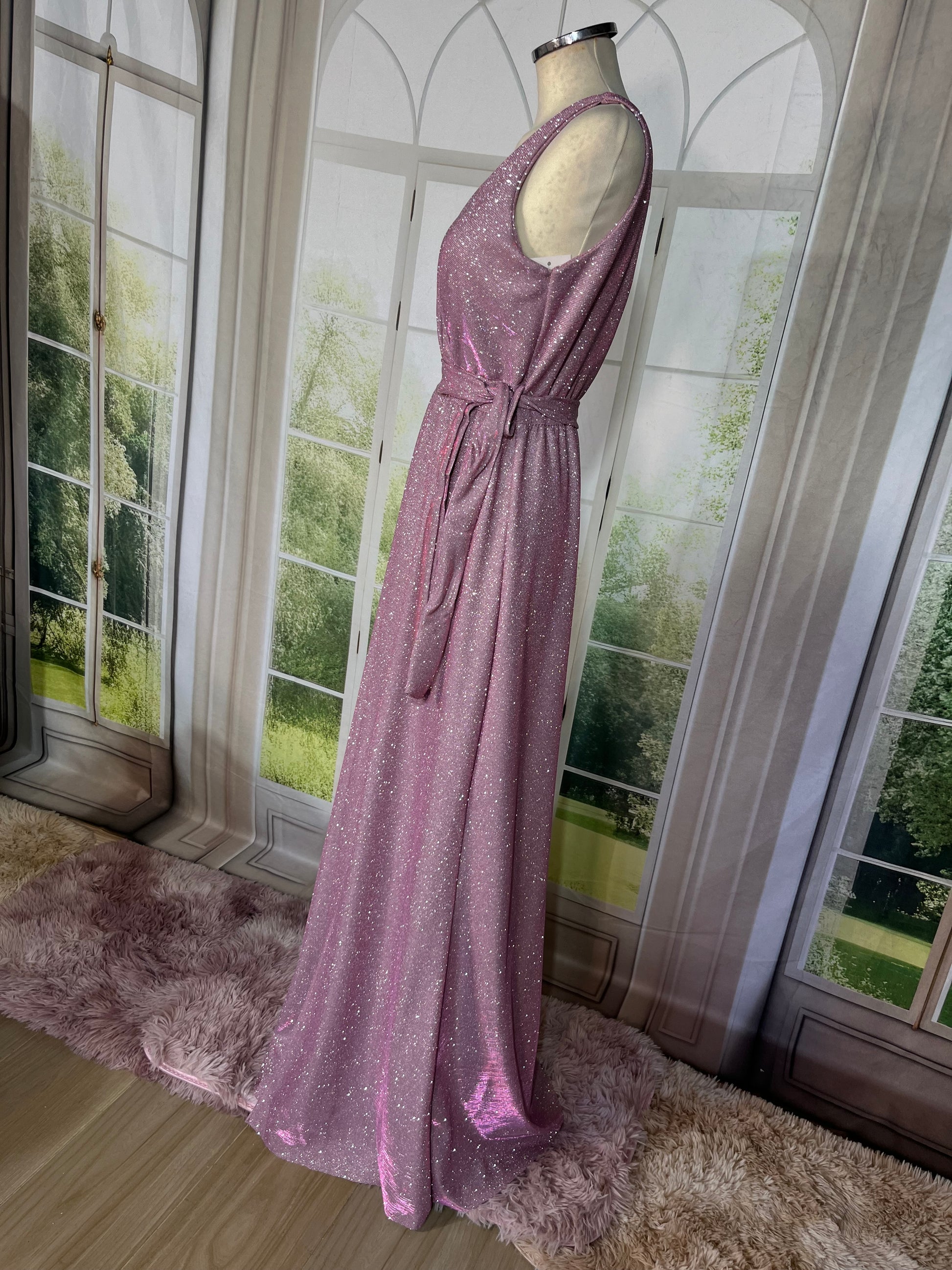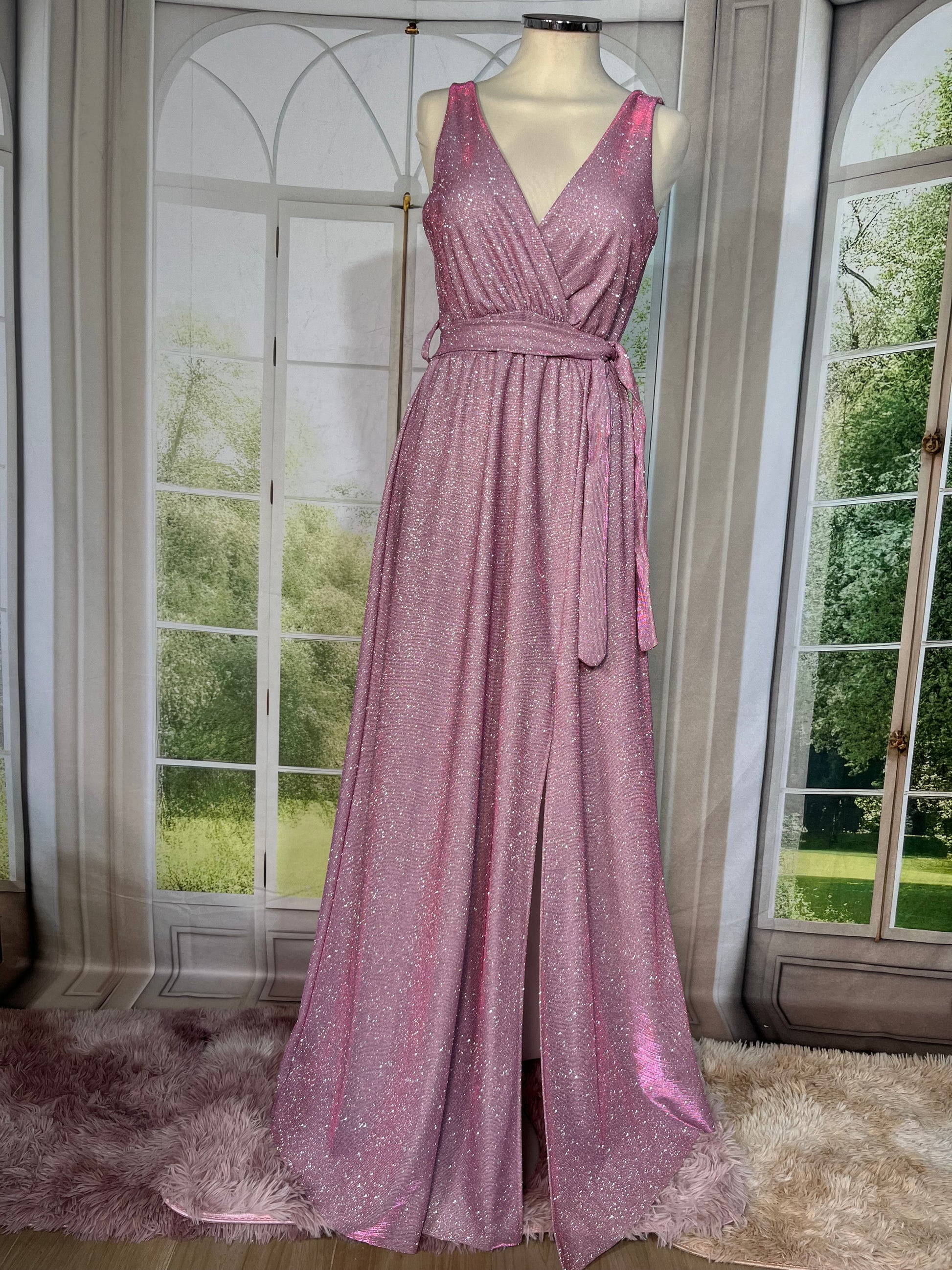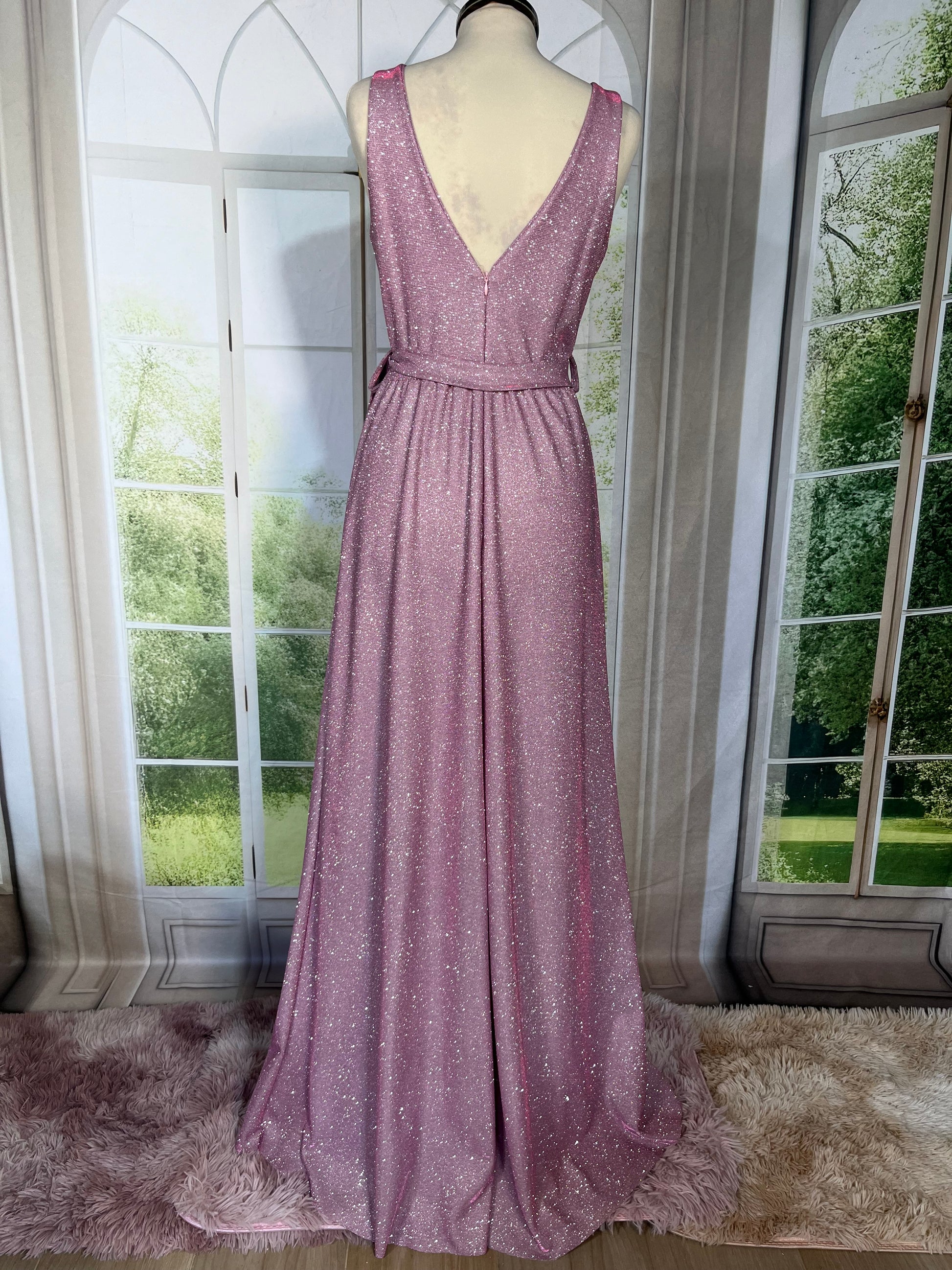 Abito lungo fondo rosa in lurex zip chiusura e cintura