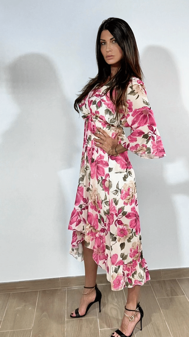 Abito Flora in chiffon stampato fondo burro con orchidee fucsia .
