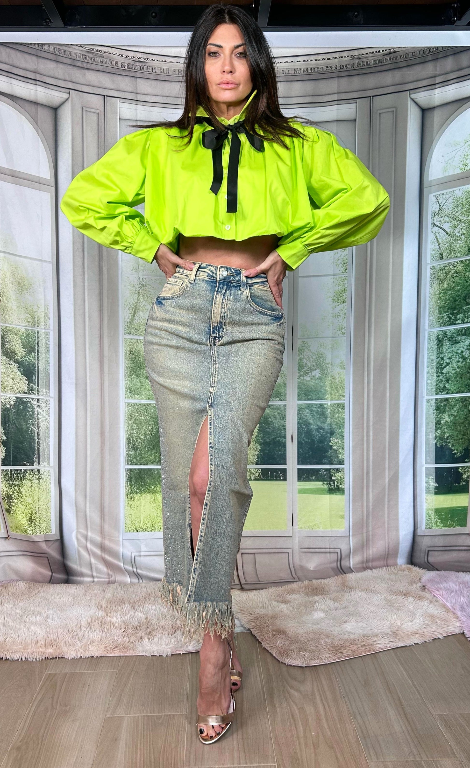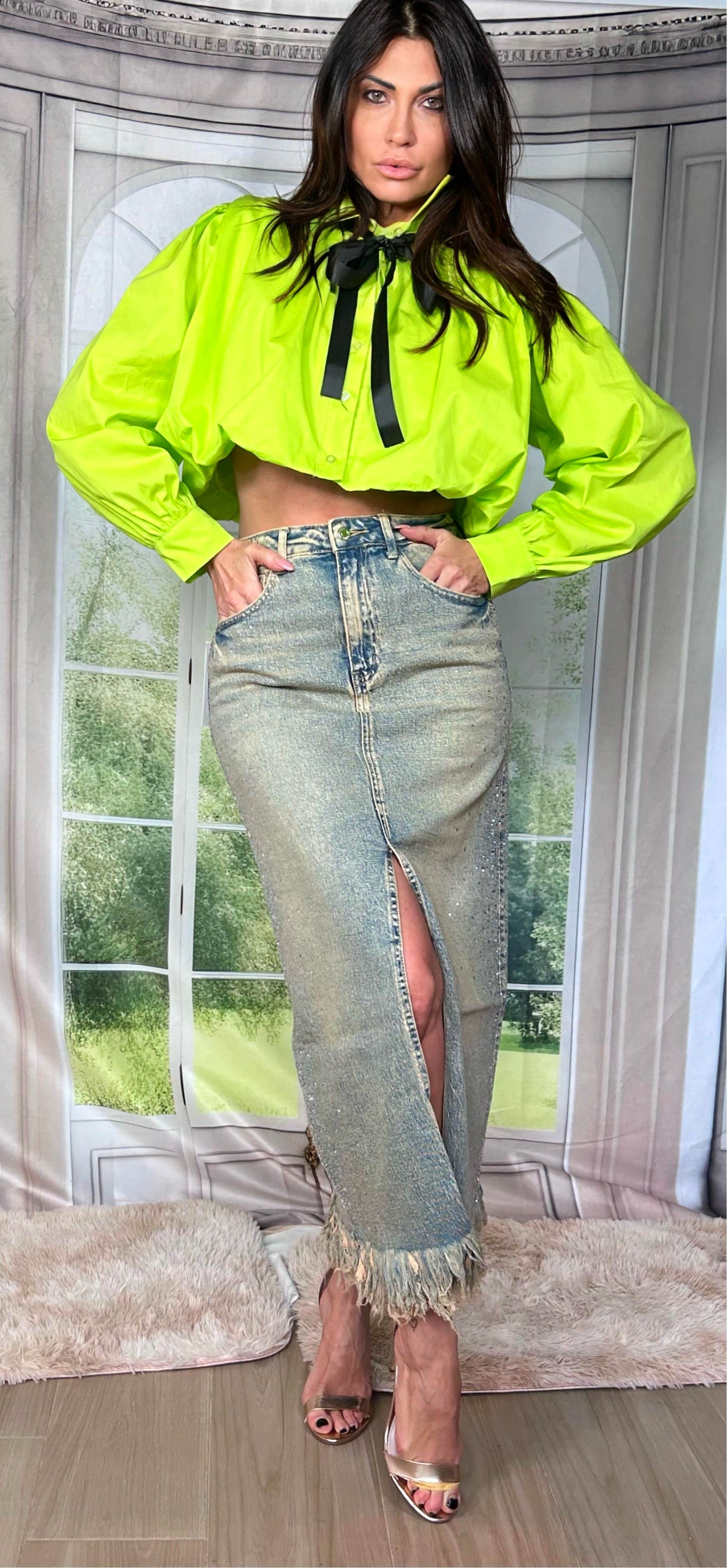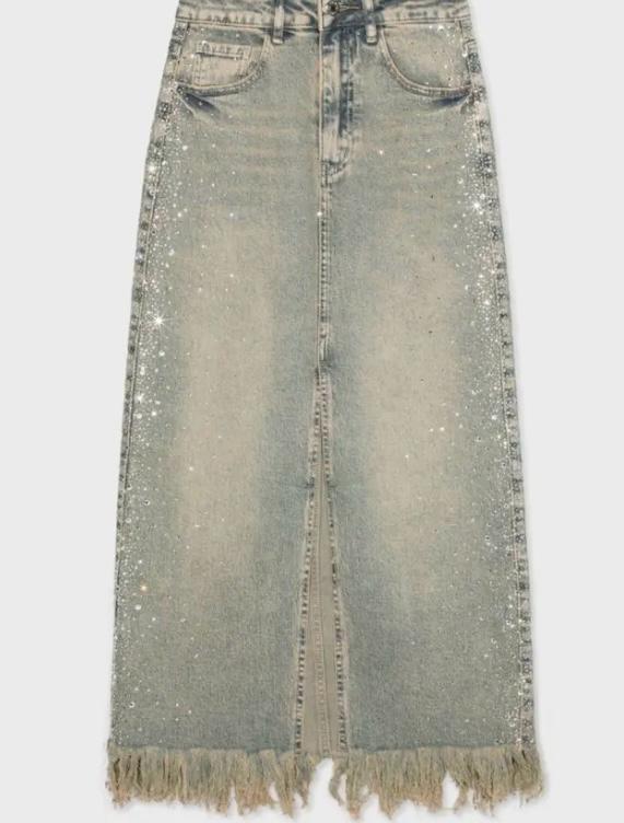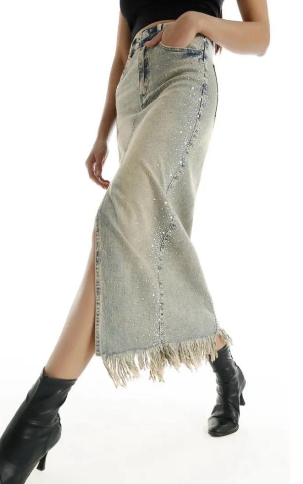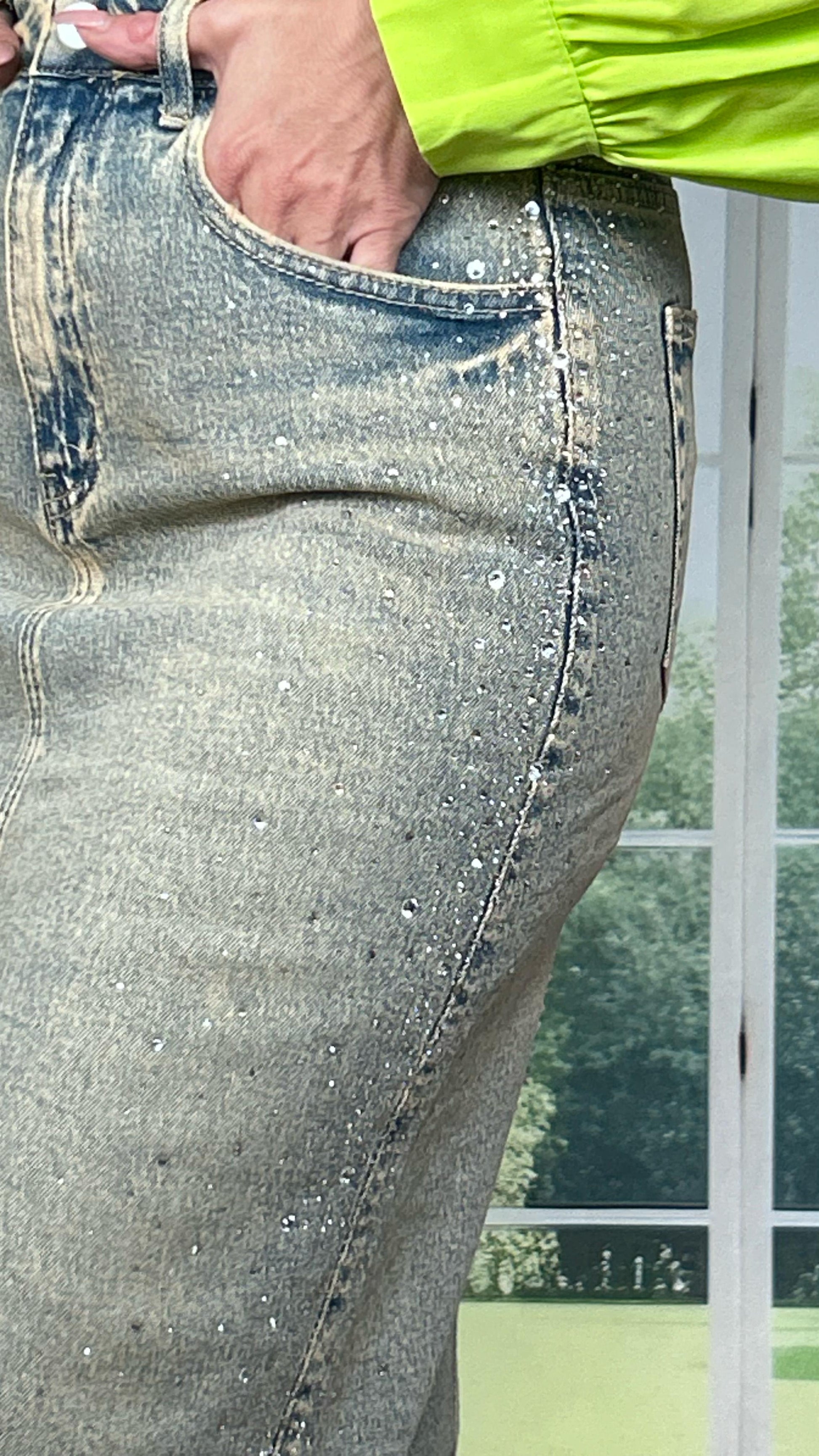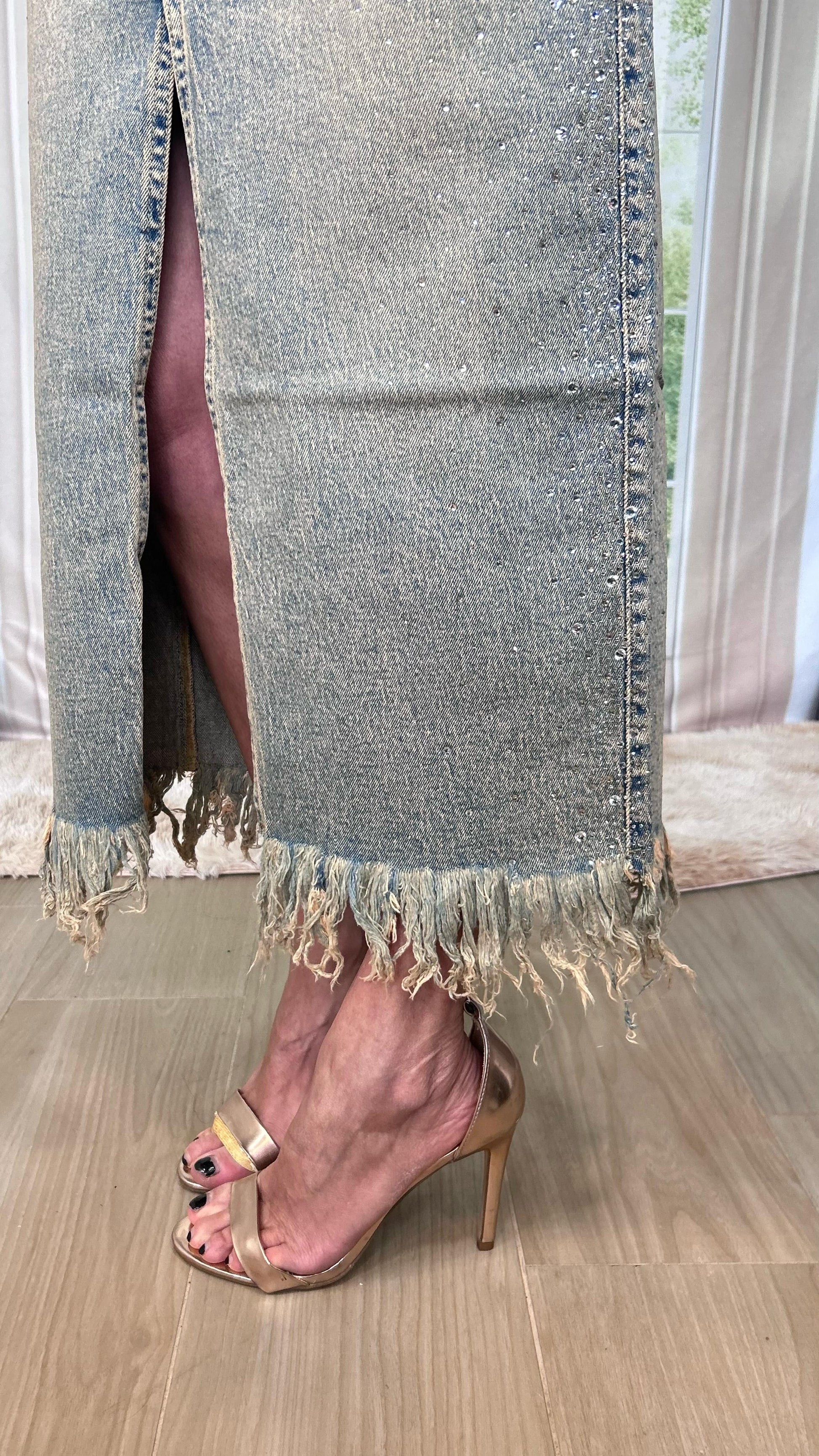 Gonna loungette in jeans sabbiato con spacco centrale orlo a frange e cristalli varie dimensioni sul fianco