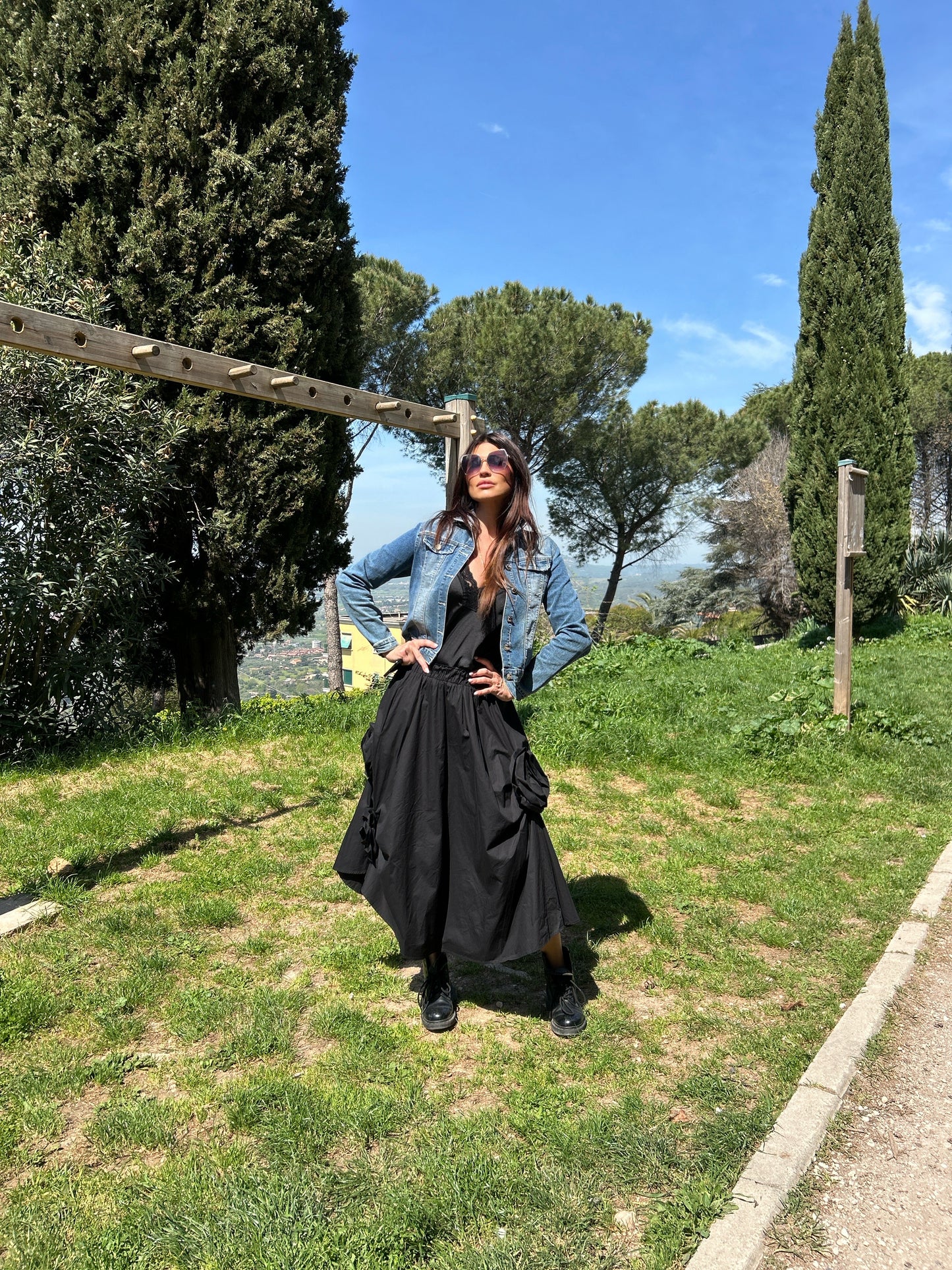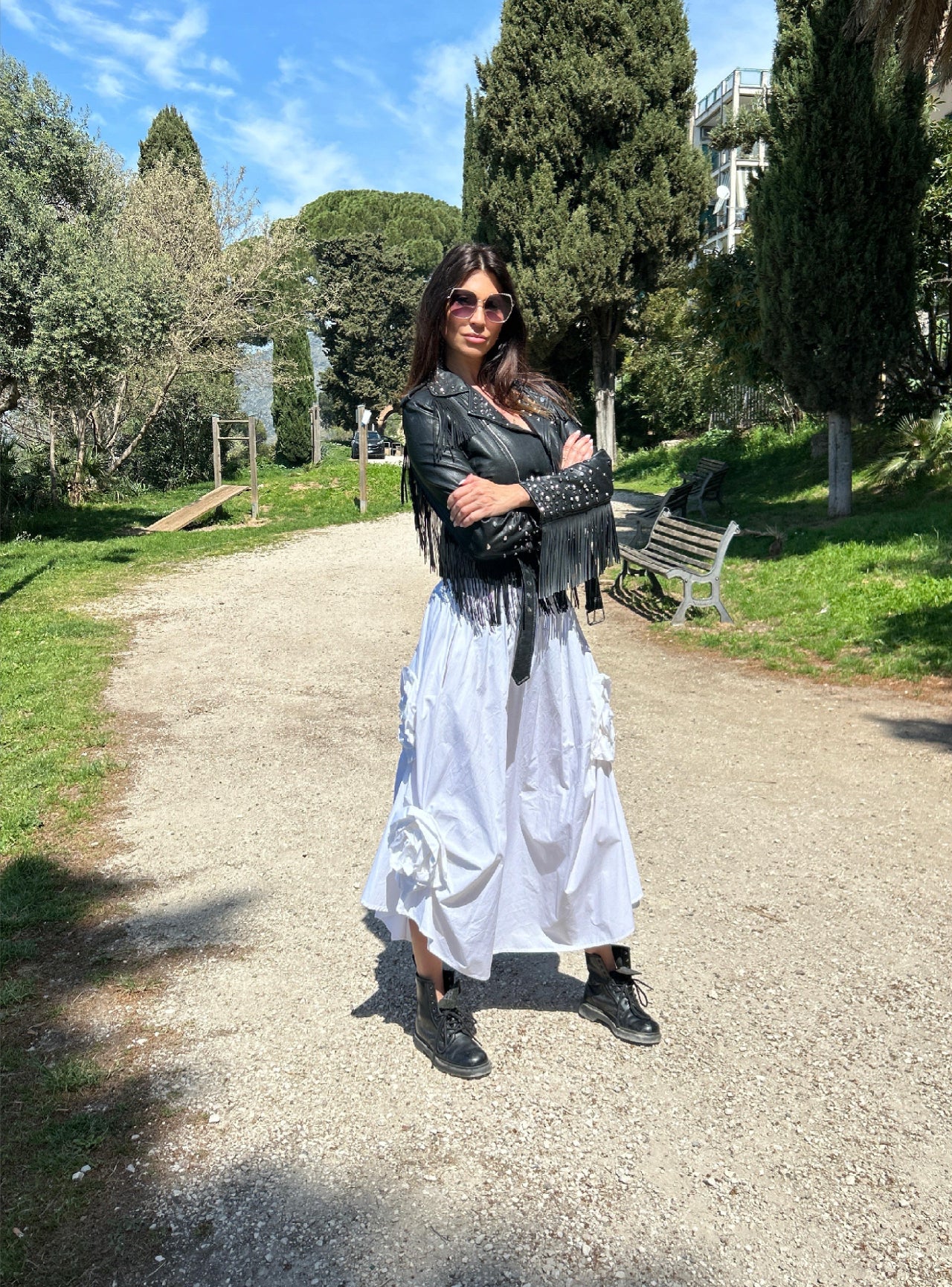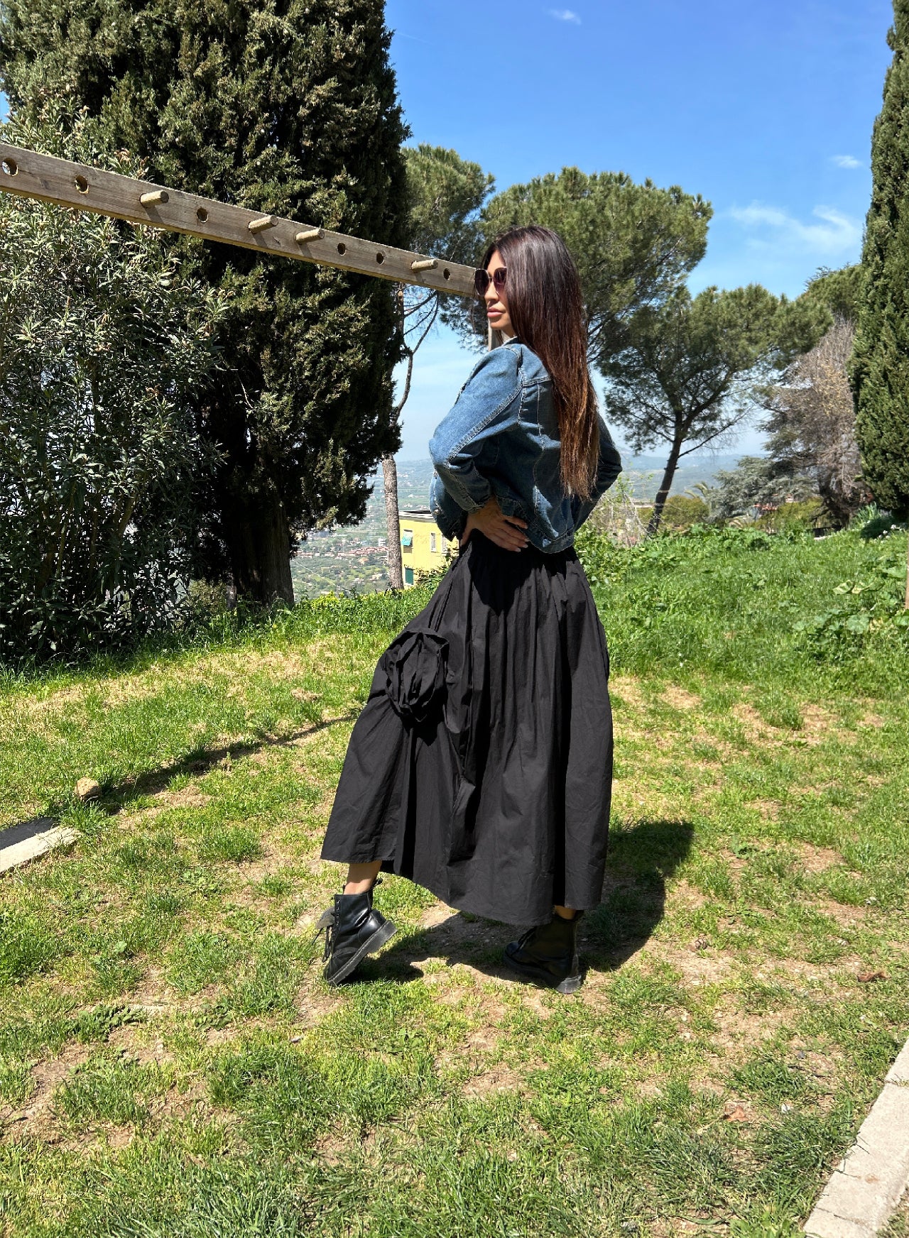 Gonna lunga in cotone ampia drappeggiata sui lati con inserite rose giganti stesso tessuto