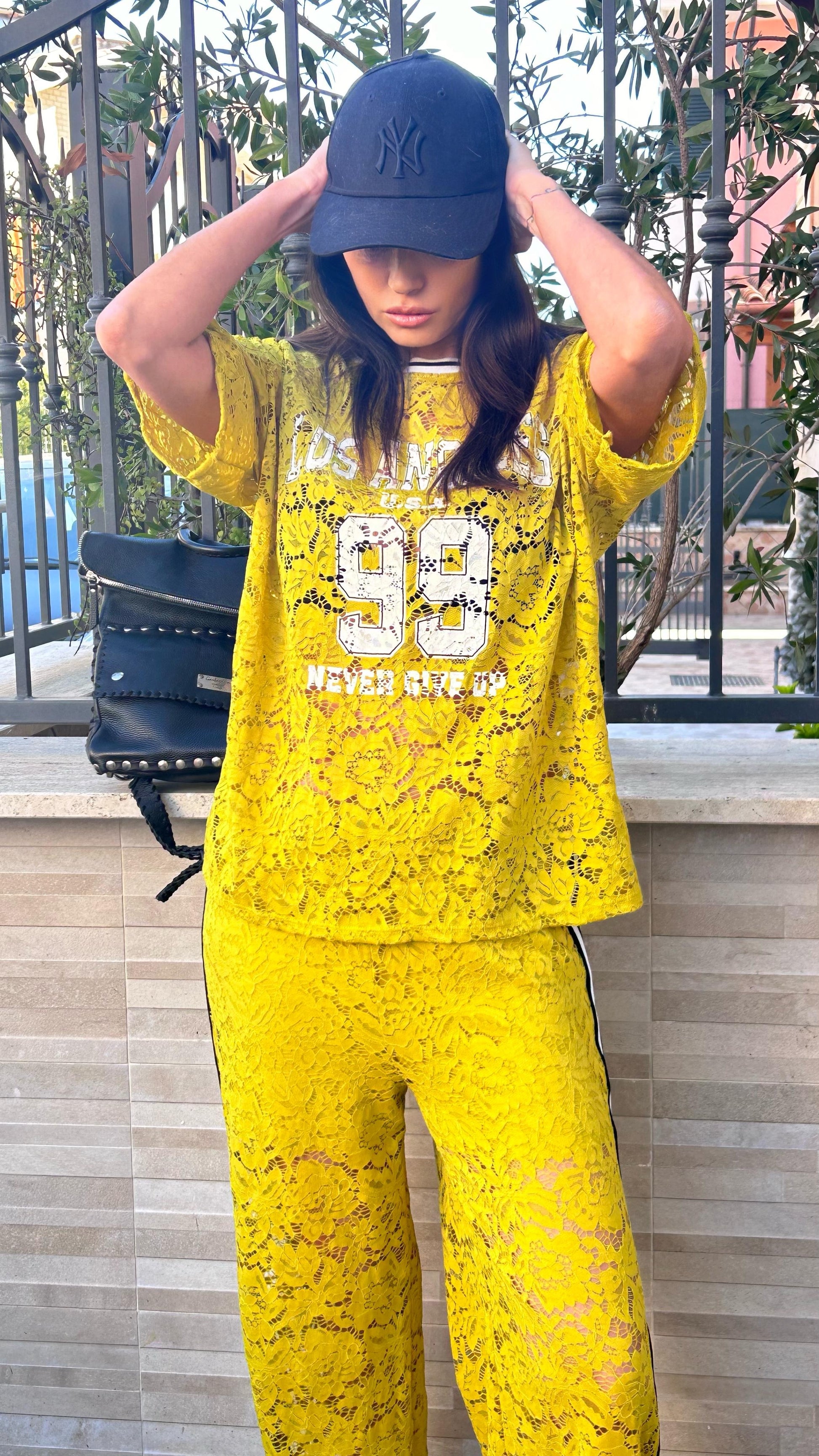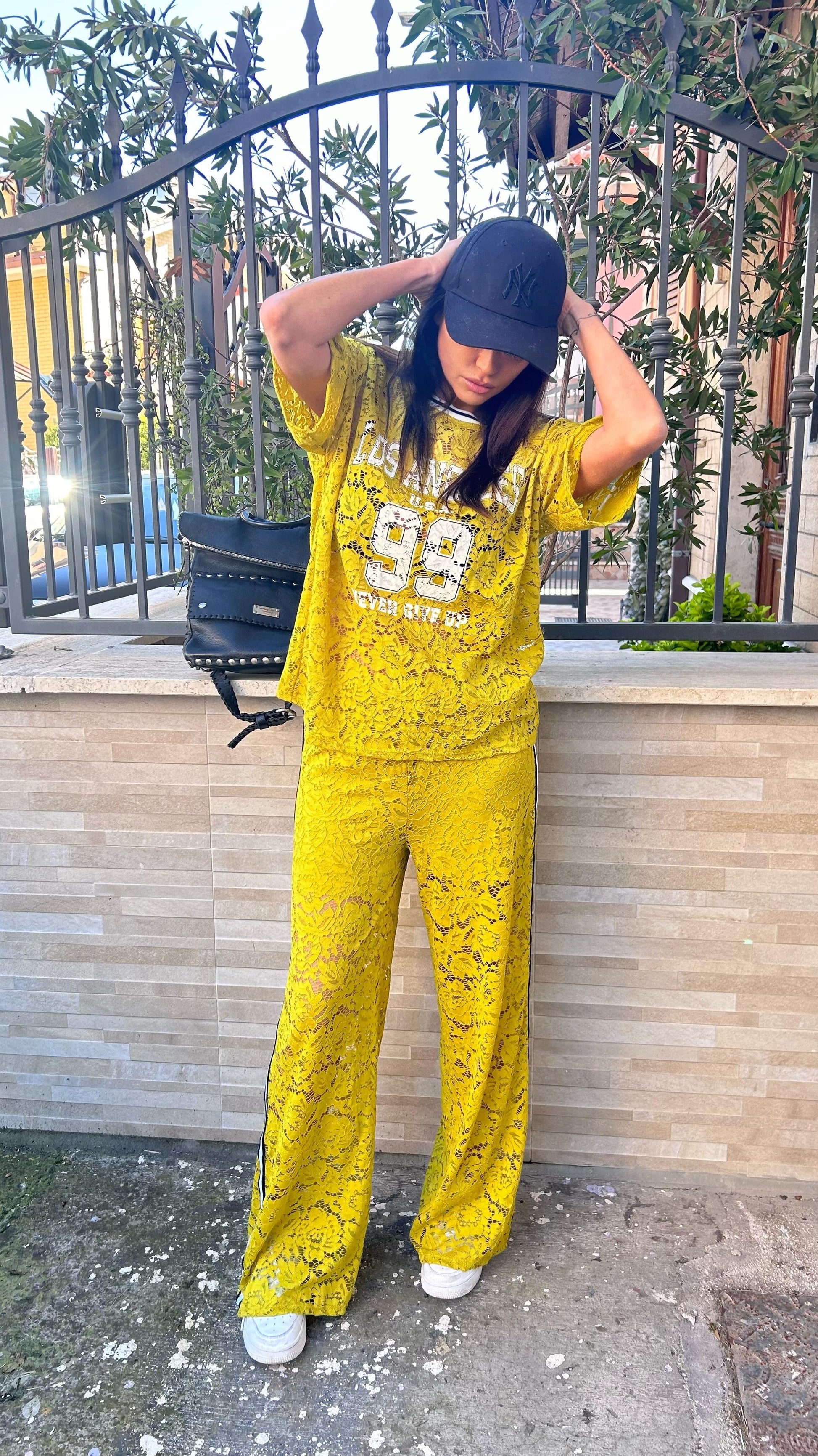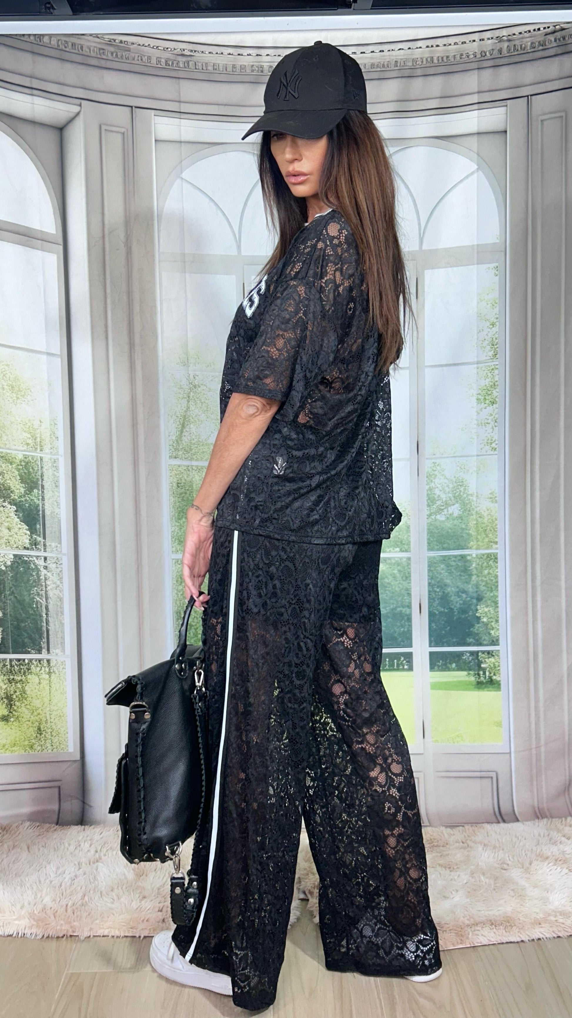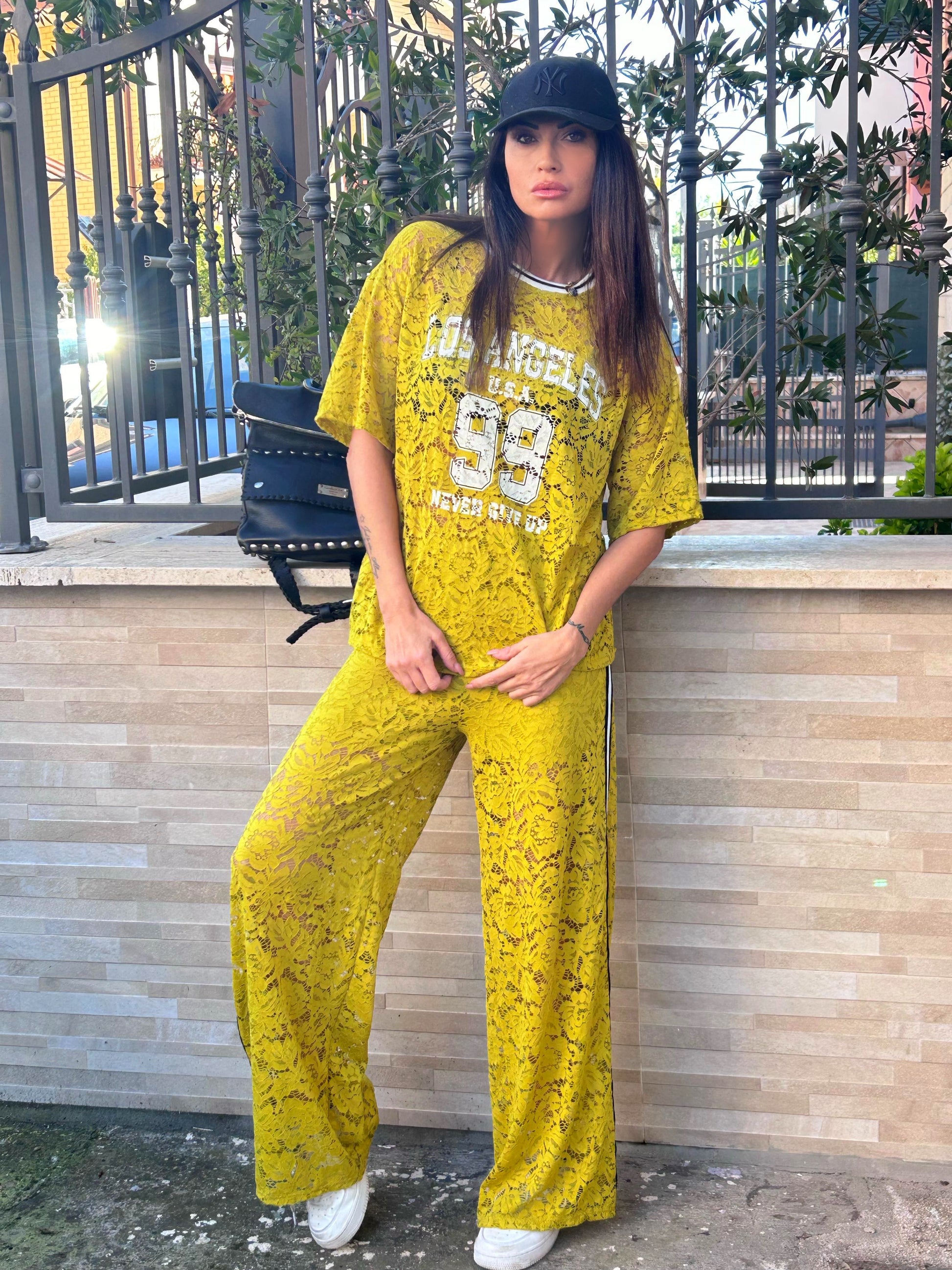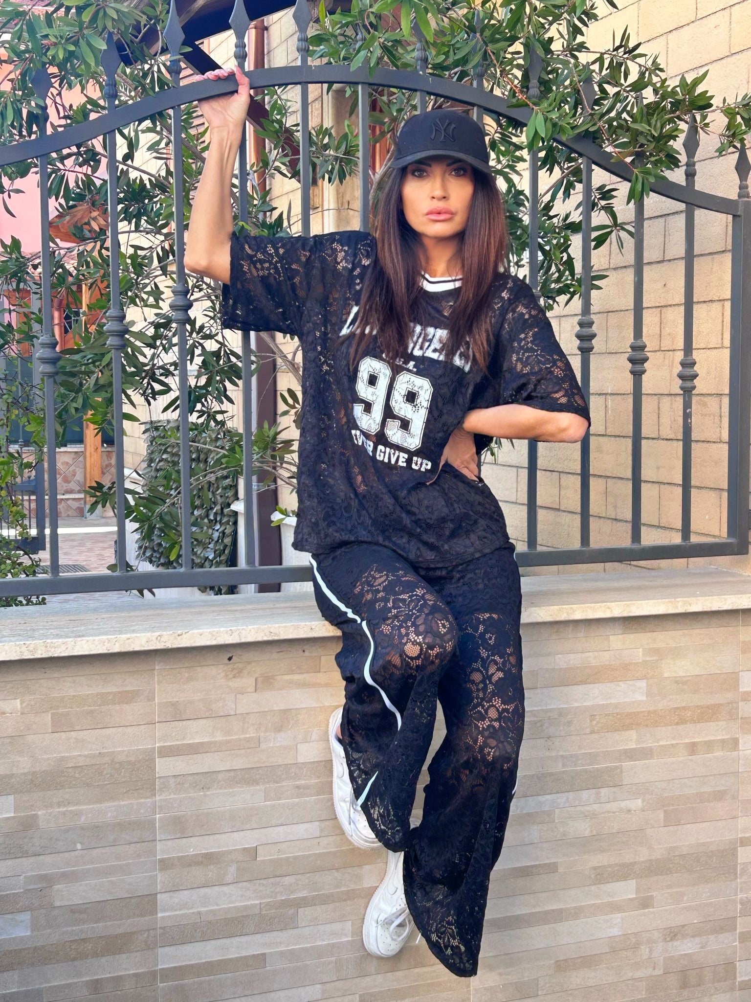 Tura Fashion in pizzo con shirt stampa ,pantaloni palazzo con elastico in vita in pizzo